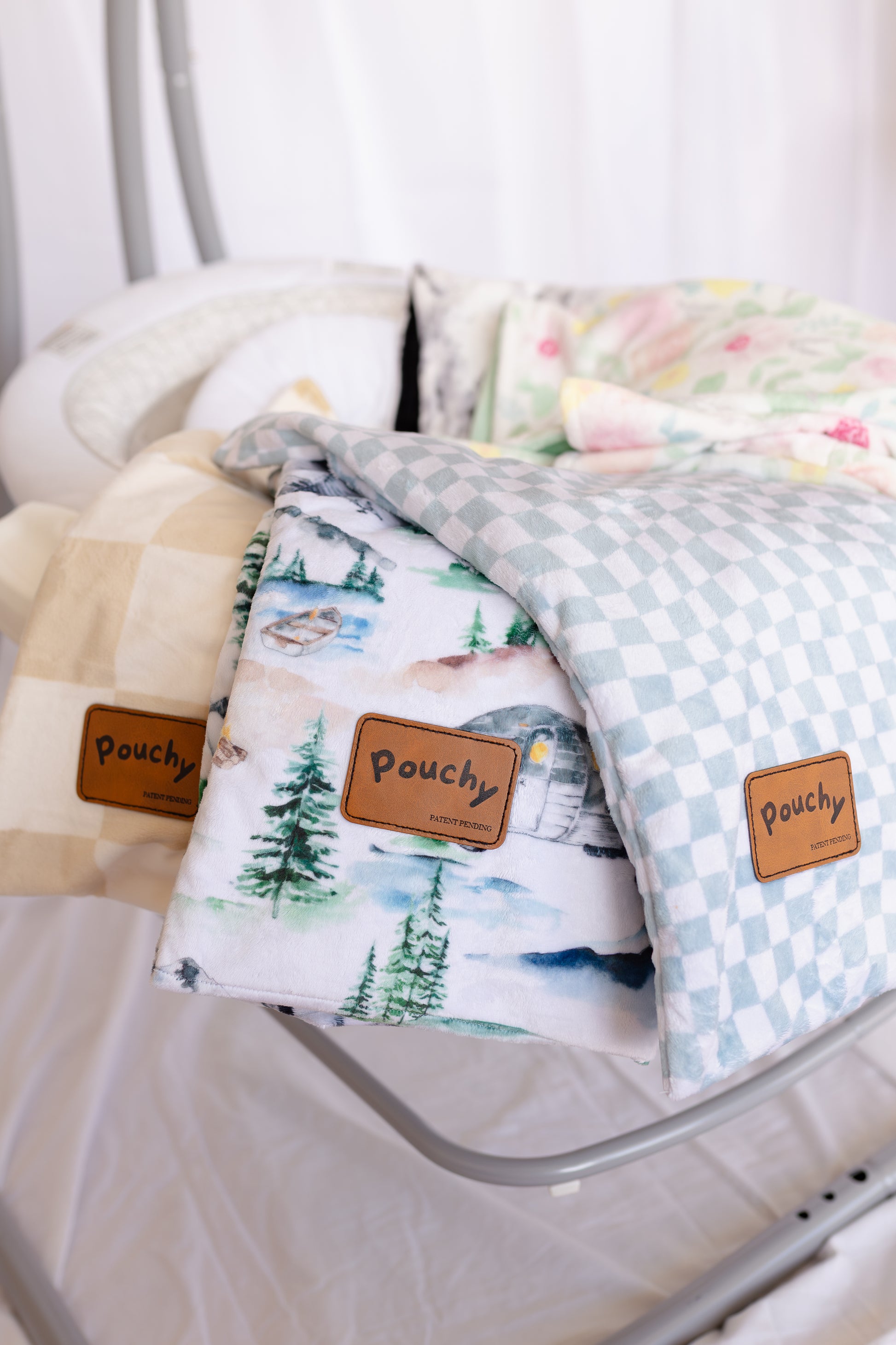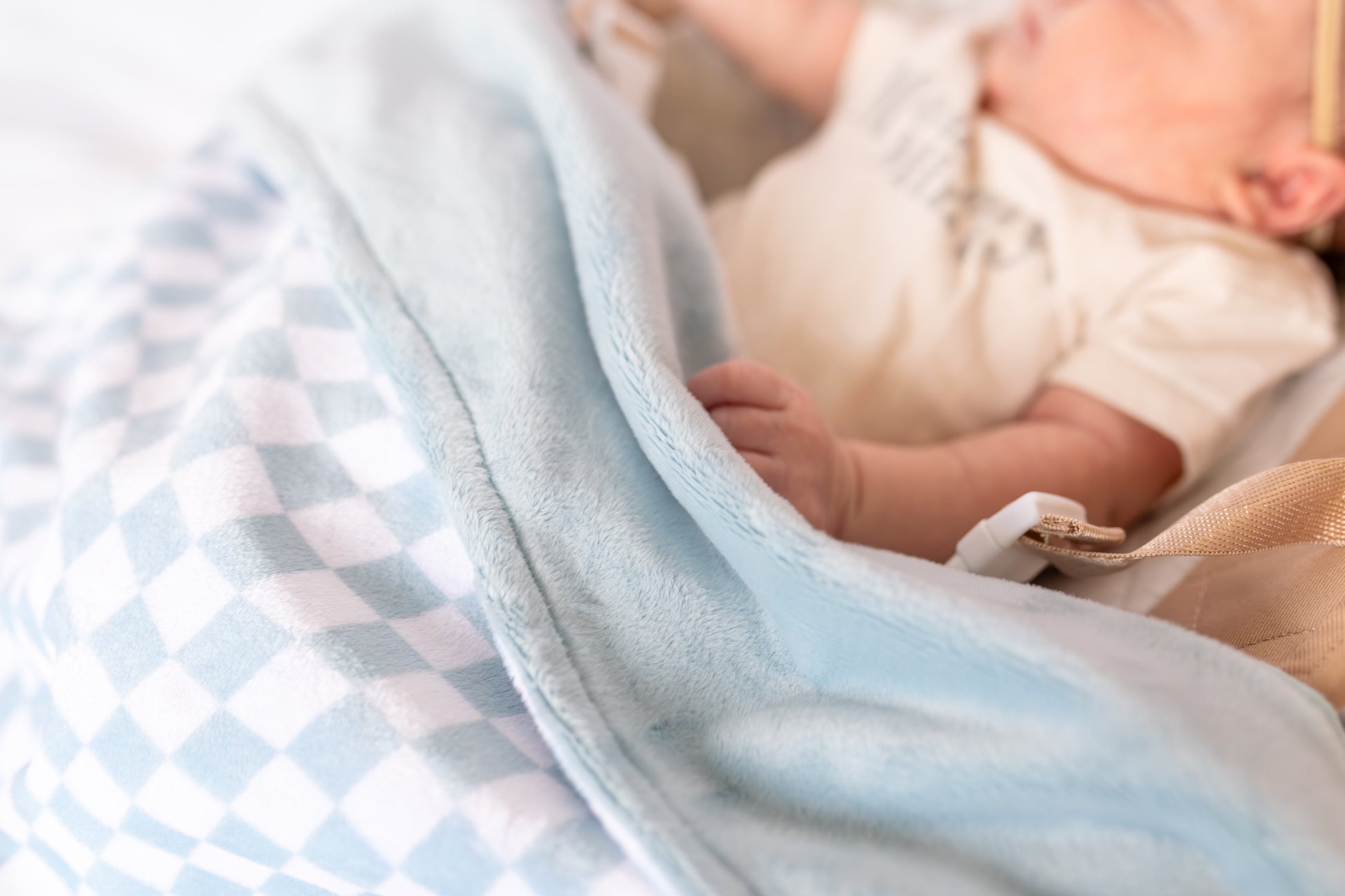 Cool vibes for little rides. The Blue Checkered Pouchy features soft sky-blue and white checkers on a clean backdrop. Double-sided minky for plush warmth. Perfect for swing snoozes, stroller breezes, and car seat naps—day or night. Machine washable. Gender-neutral.”