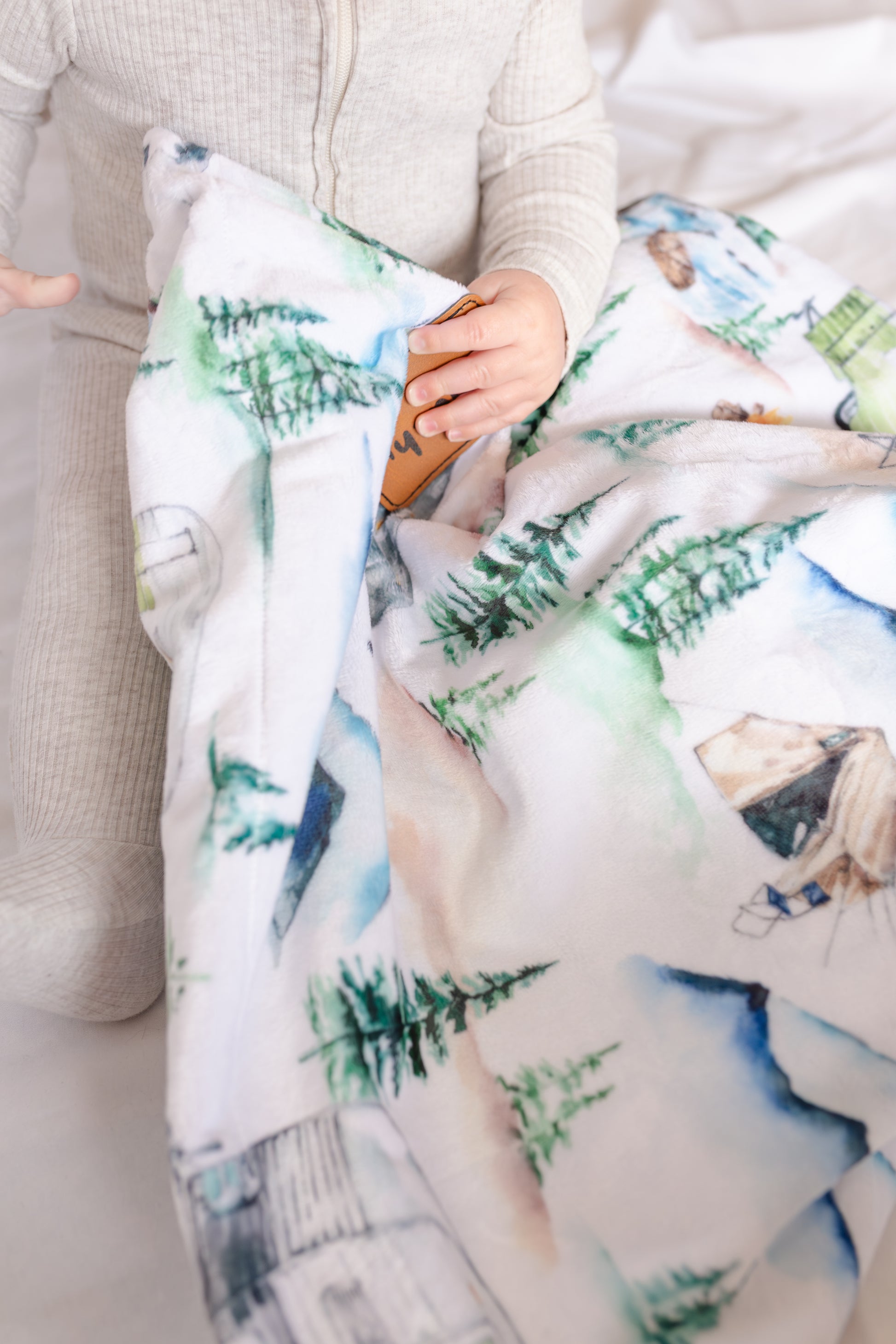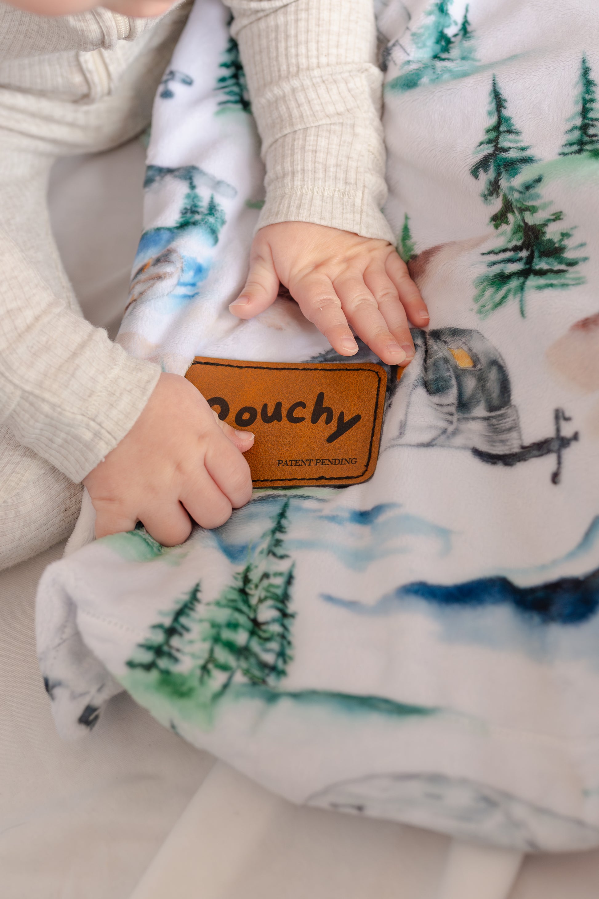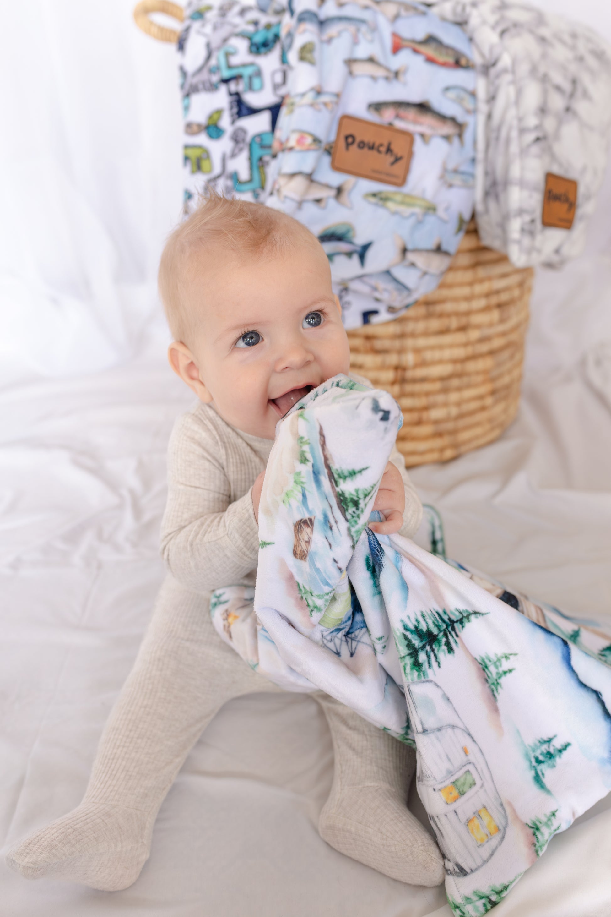Adventure starts at nap time. The Camper Pouchy features watercolor airstreams, pine forests, and misty mountains in soft greens and blues. Double-sided minky for plush warmth. Perfect for car seat naps, stroller strolls, or tucking around baby in the baby swing —day or night.