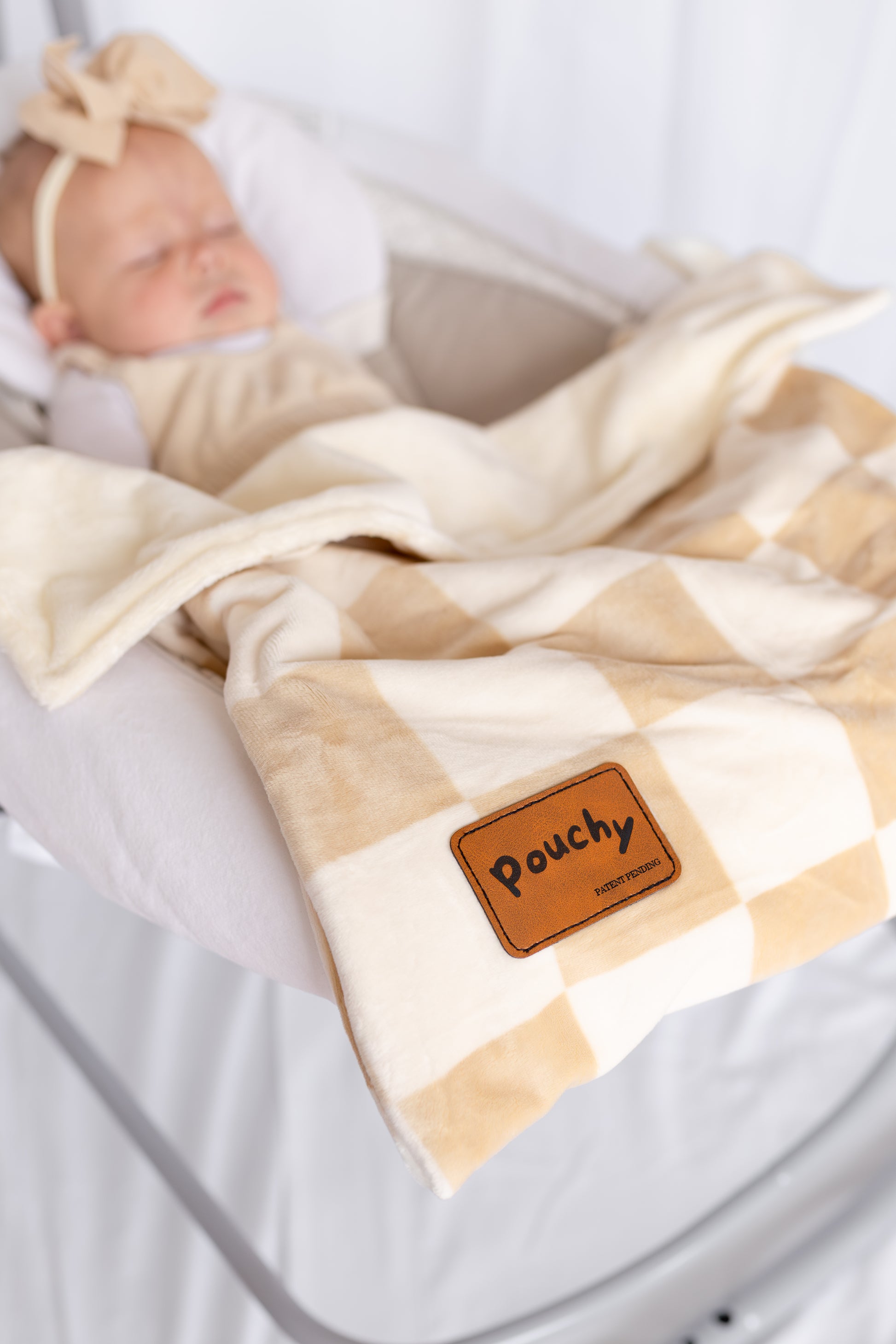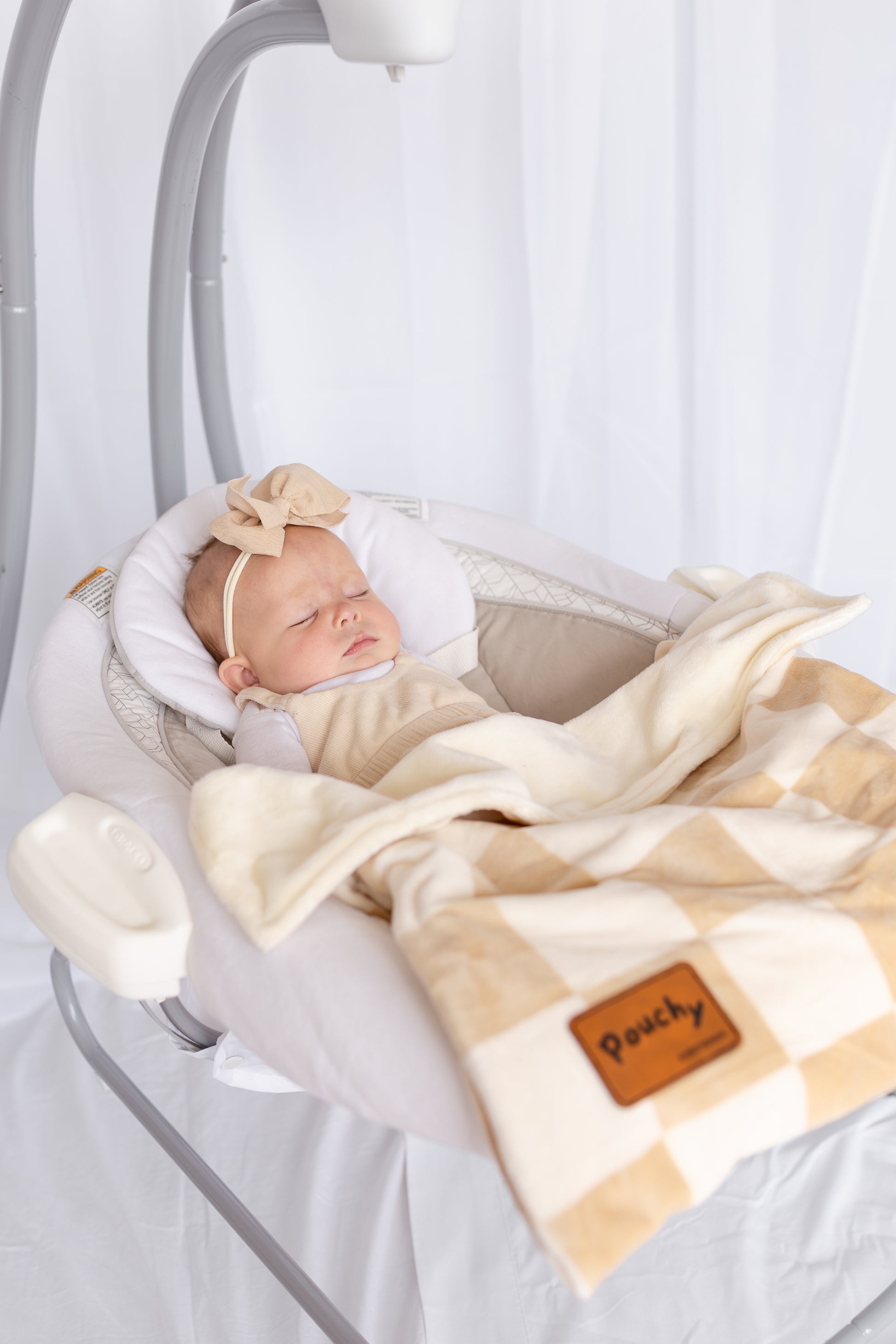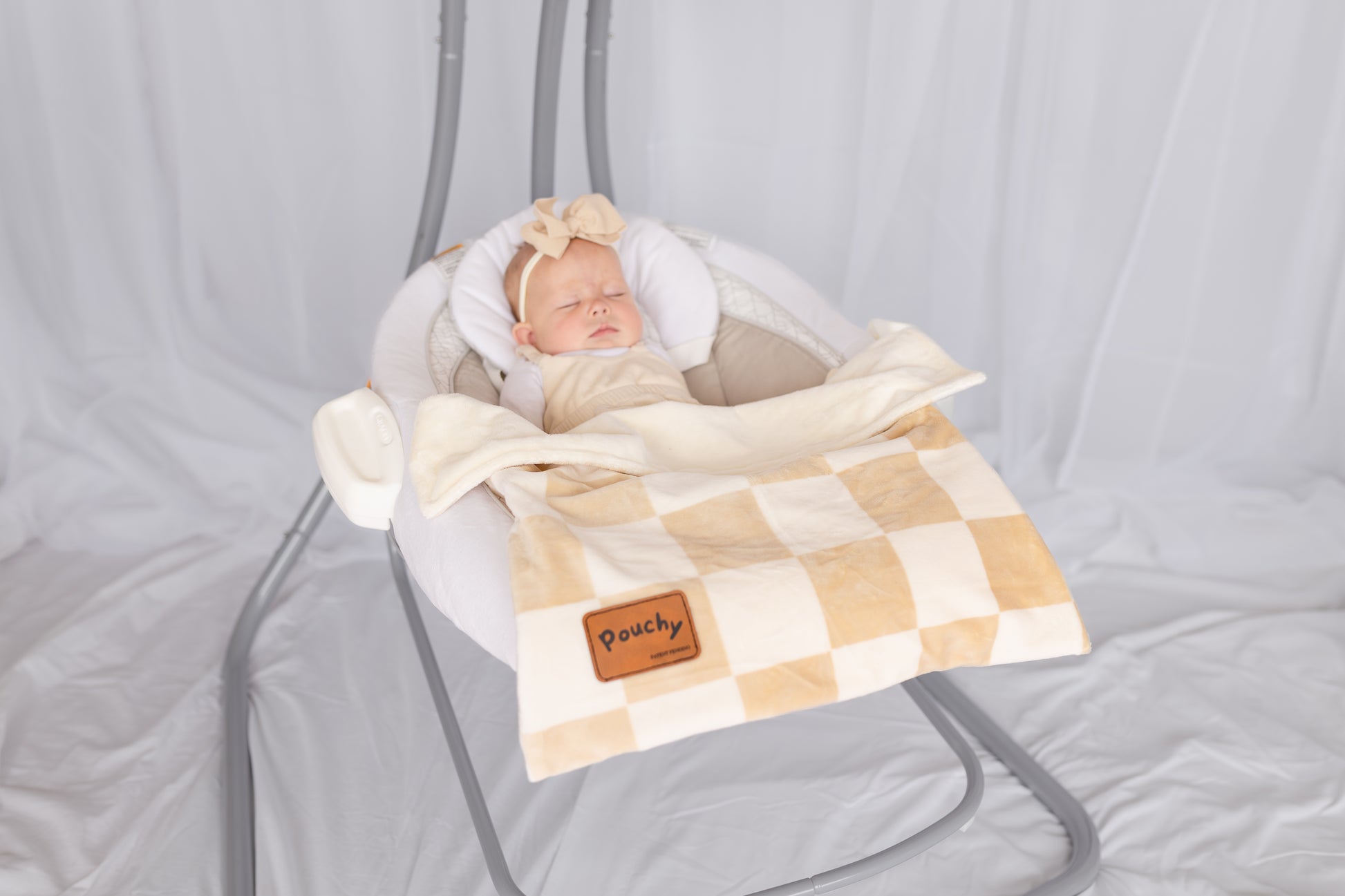 Classic comfort for every baby. The Beige Checkered Pouchy features soft latte and cream checkers. Double-sided minky for plush warmth. Perfect for swing snoozes, stroller strolls, and car seat naps—day or night. Machine washable. Truly gender-neutral.