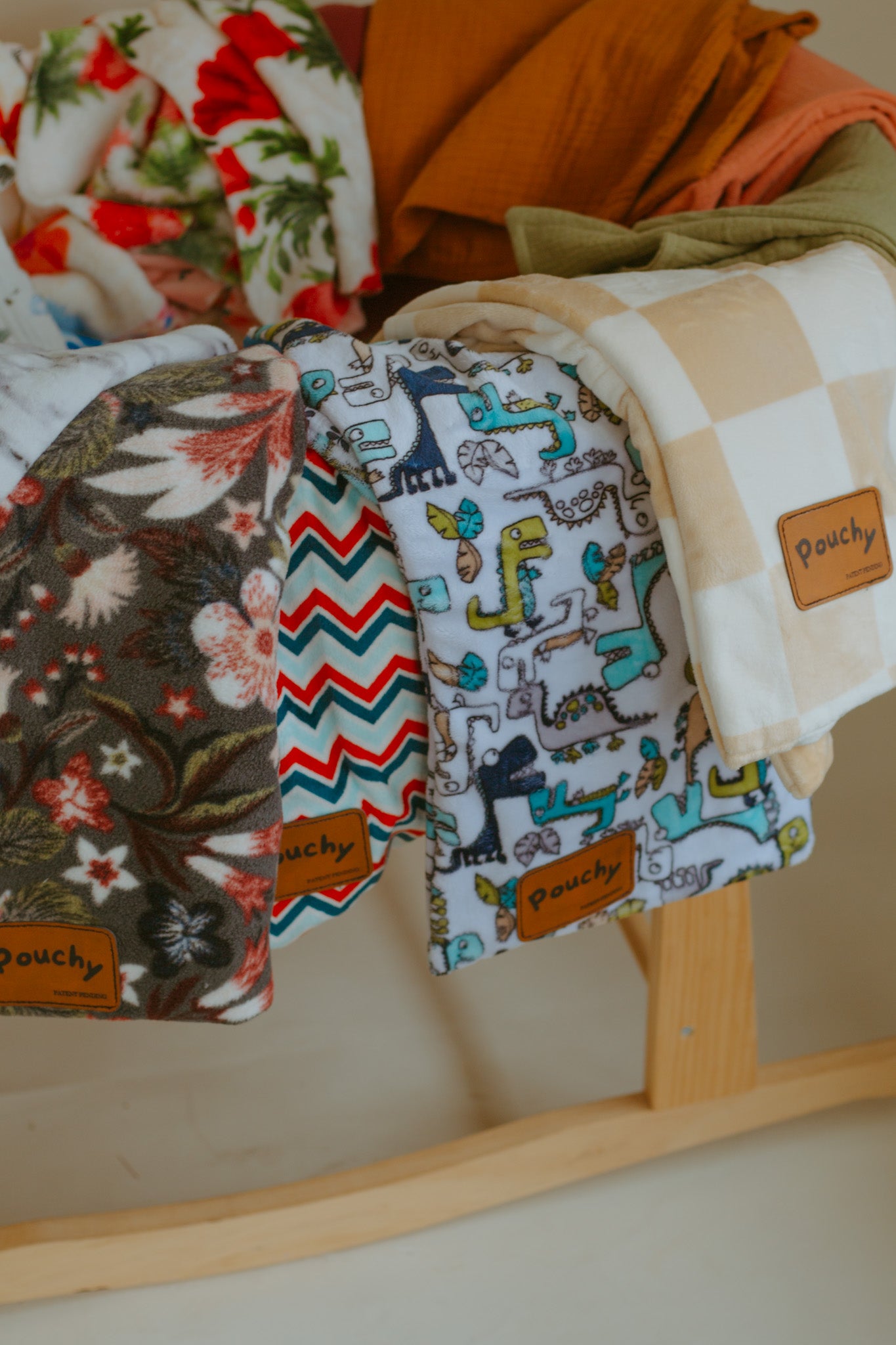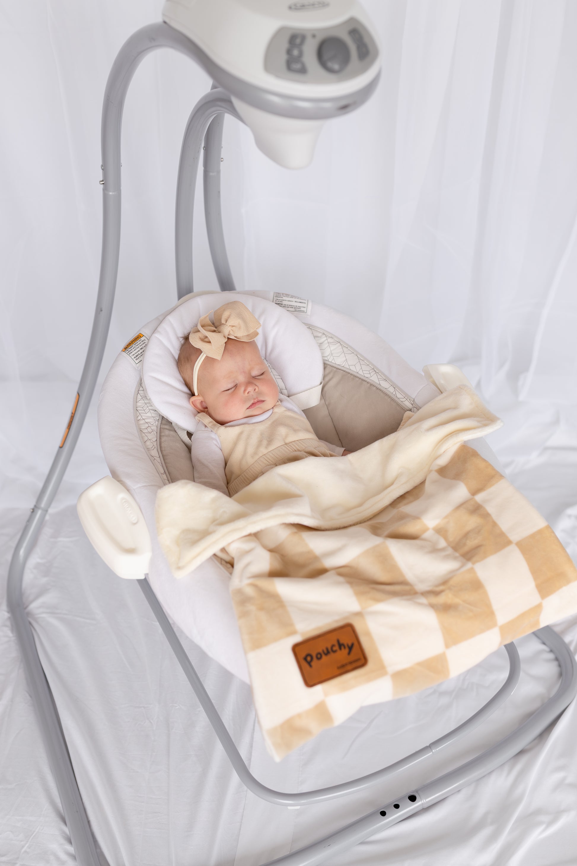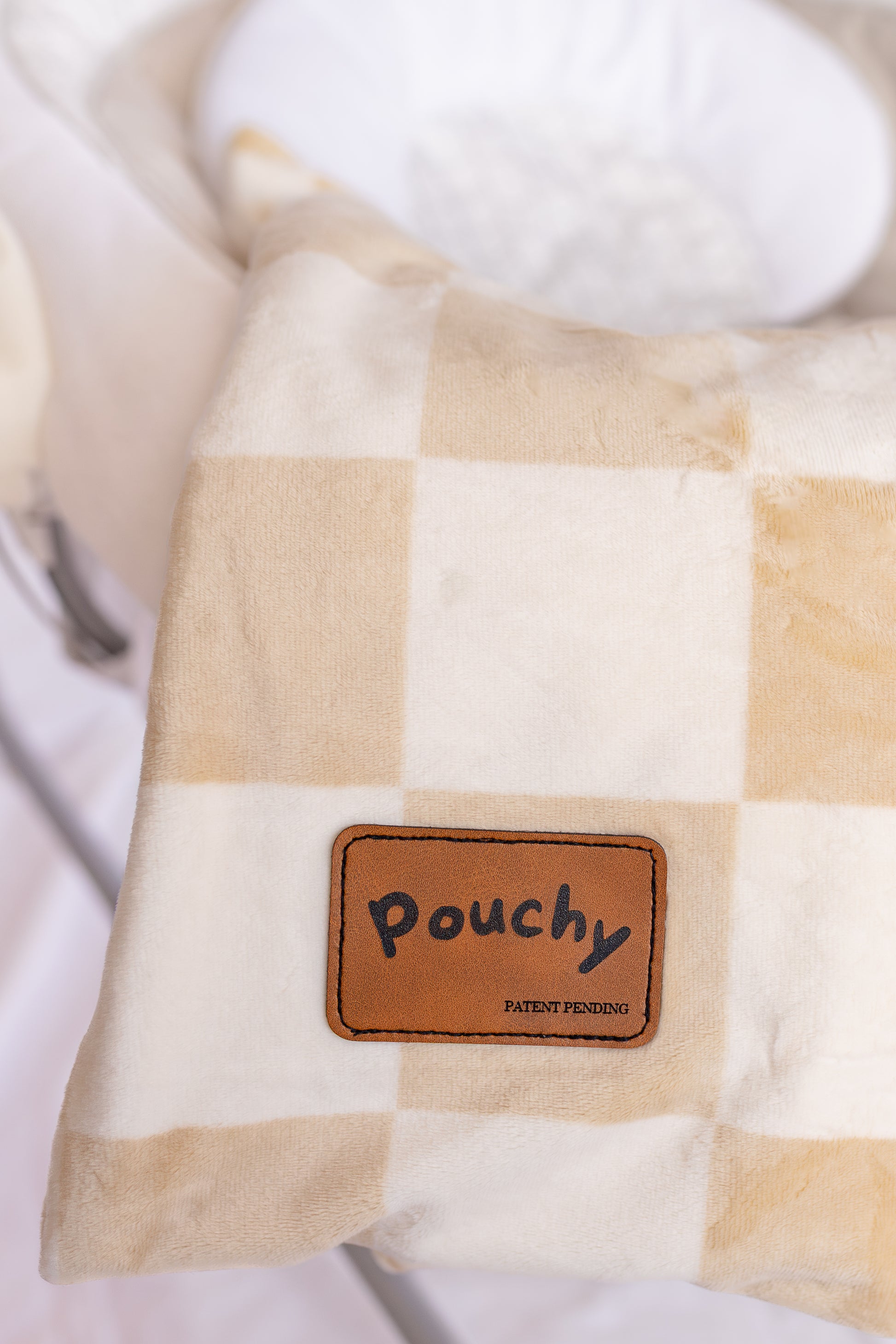 Classic comfort for every baby. The Beige Checkered Pouchy features soft latte and cream checkers. Double-sided minky for plush warmth. Perfect for swing snoozes, stroller strolls, and car seat naps—day or night. Machine washable. Truly gender-neutral.