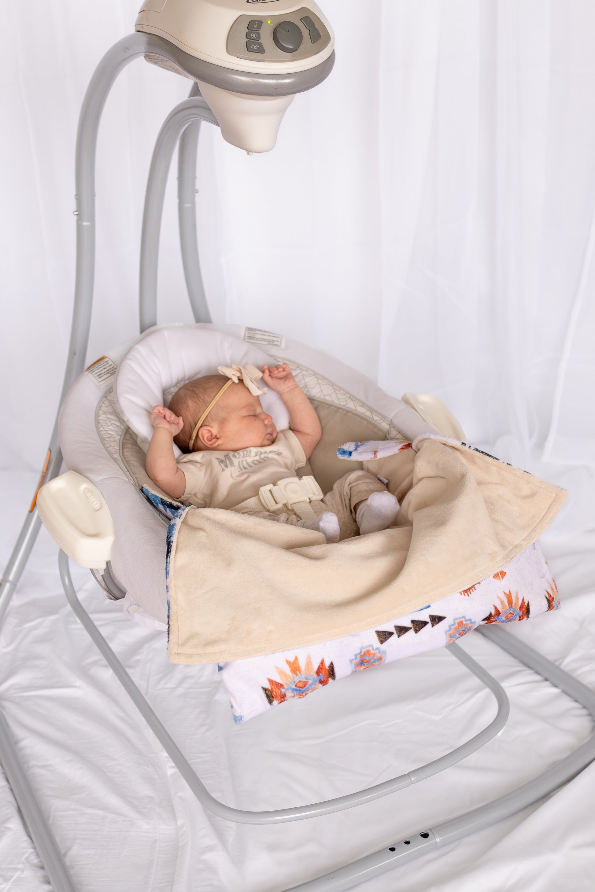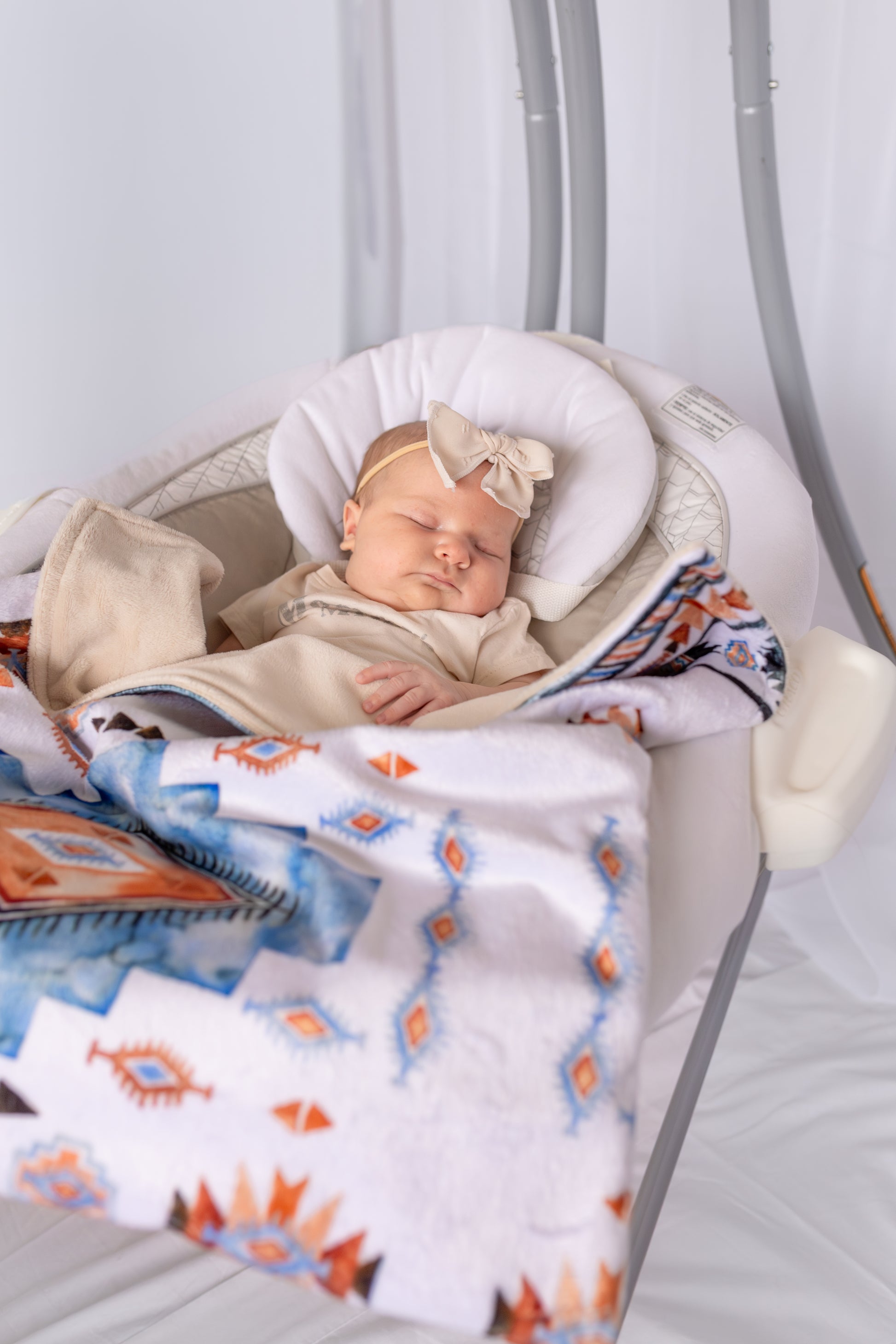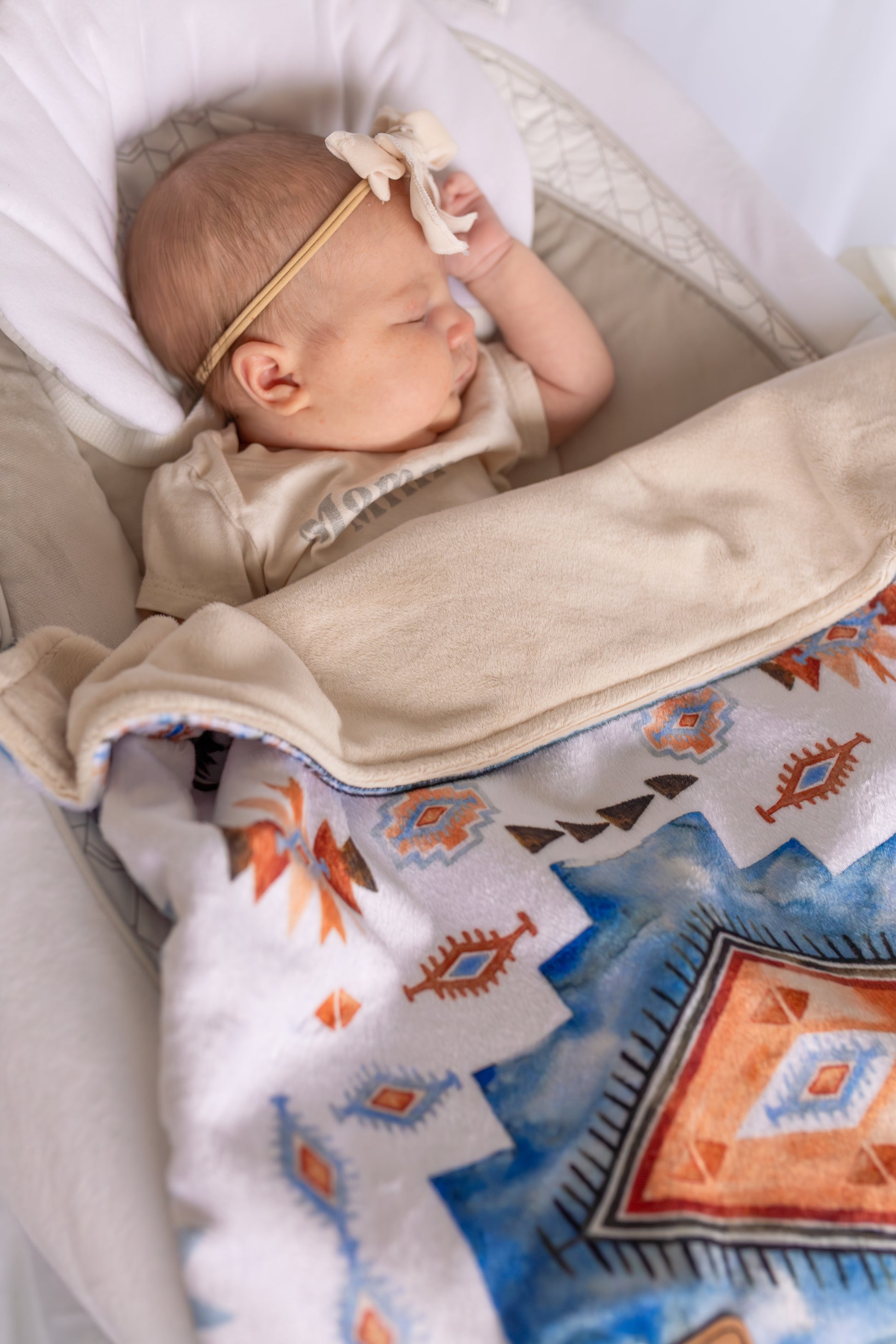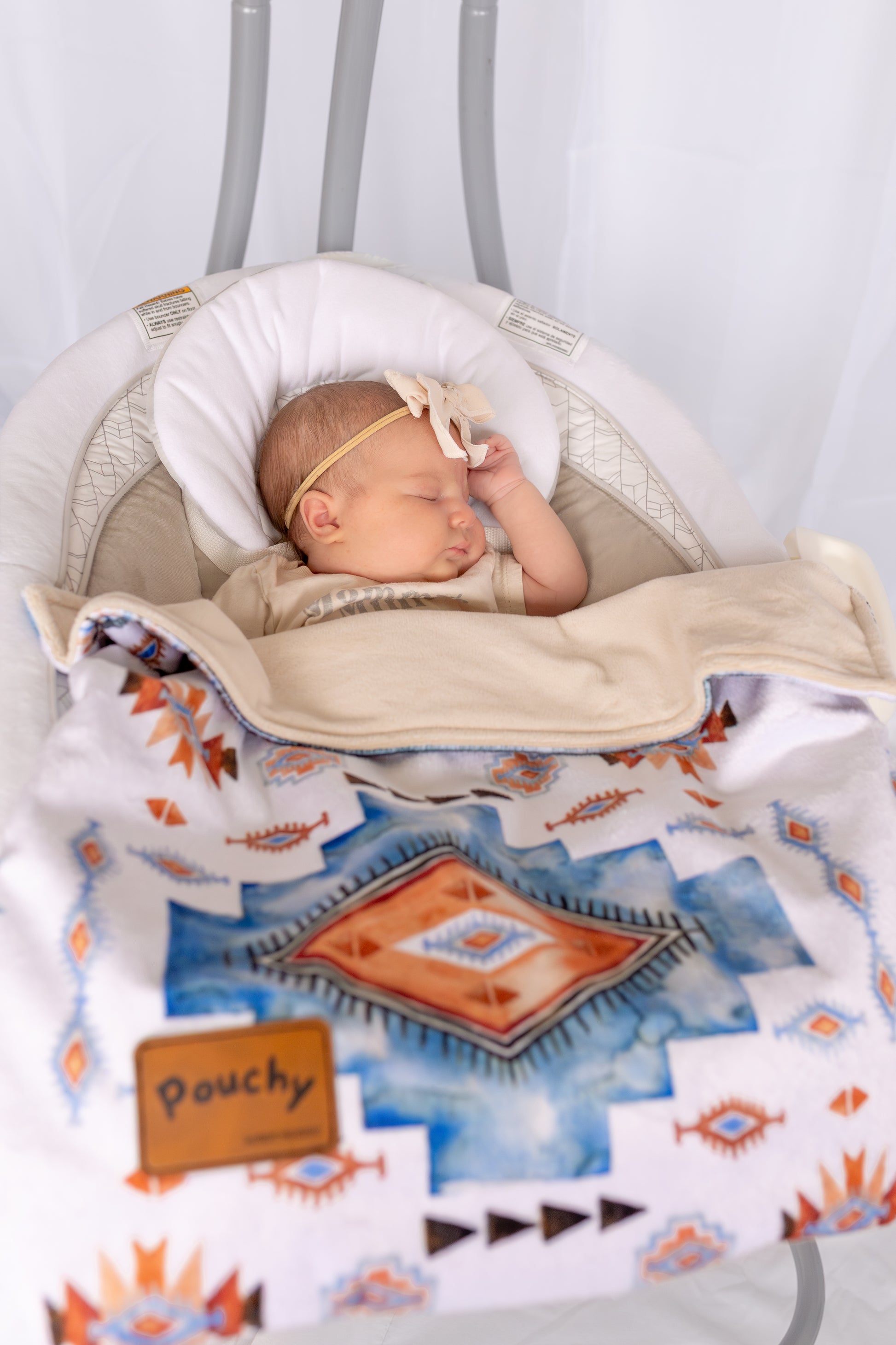 Bold Southwestern style meets all-day comfort. The Desert Diamond Pouchy features a striking Navajo-inspired diamond motif in terracotta, black, and sky blue. Crafted with ultra-soft, double-sided minky for luxurious warmth. Perfect for car seat naps, stroller strolls, or tucking around baby in the baby swing —day or night.